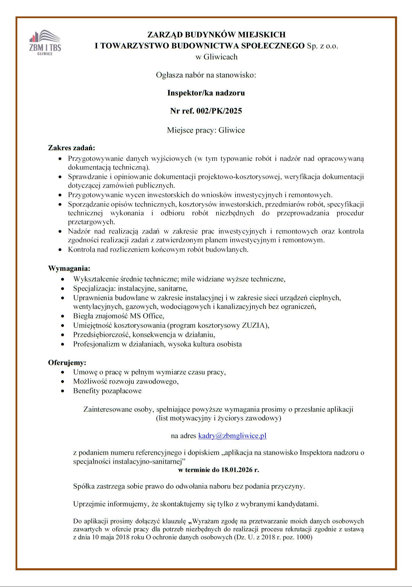 Oferta pracy – Inspektor/ka nadzoru