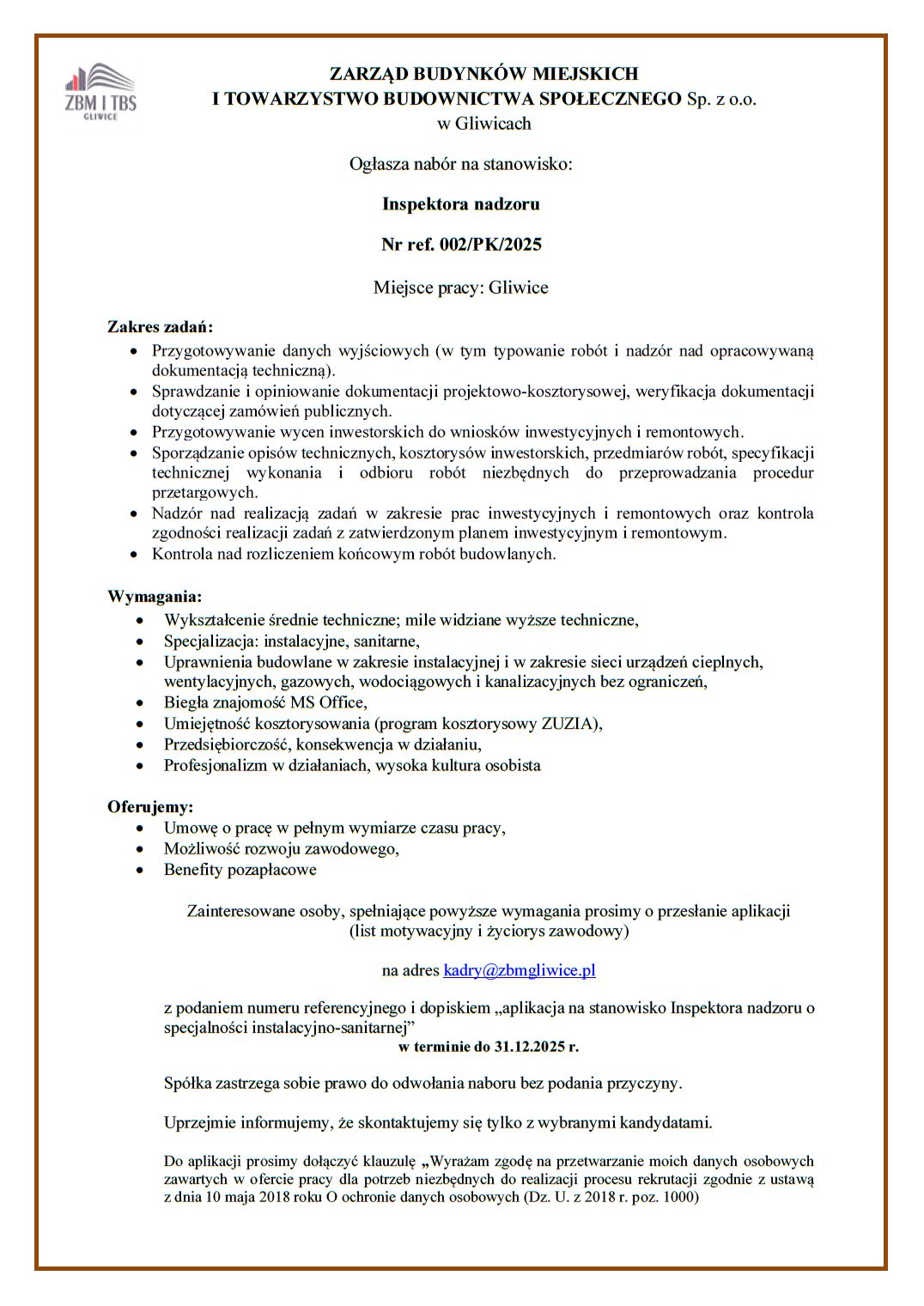 Oferta pracy – Inspektor nadzoru o...